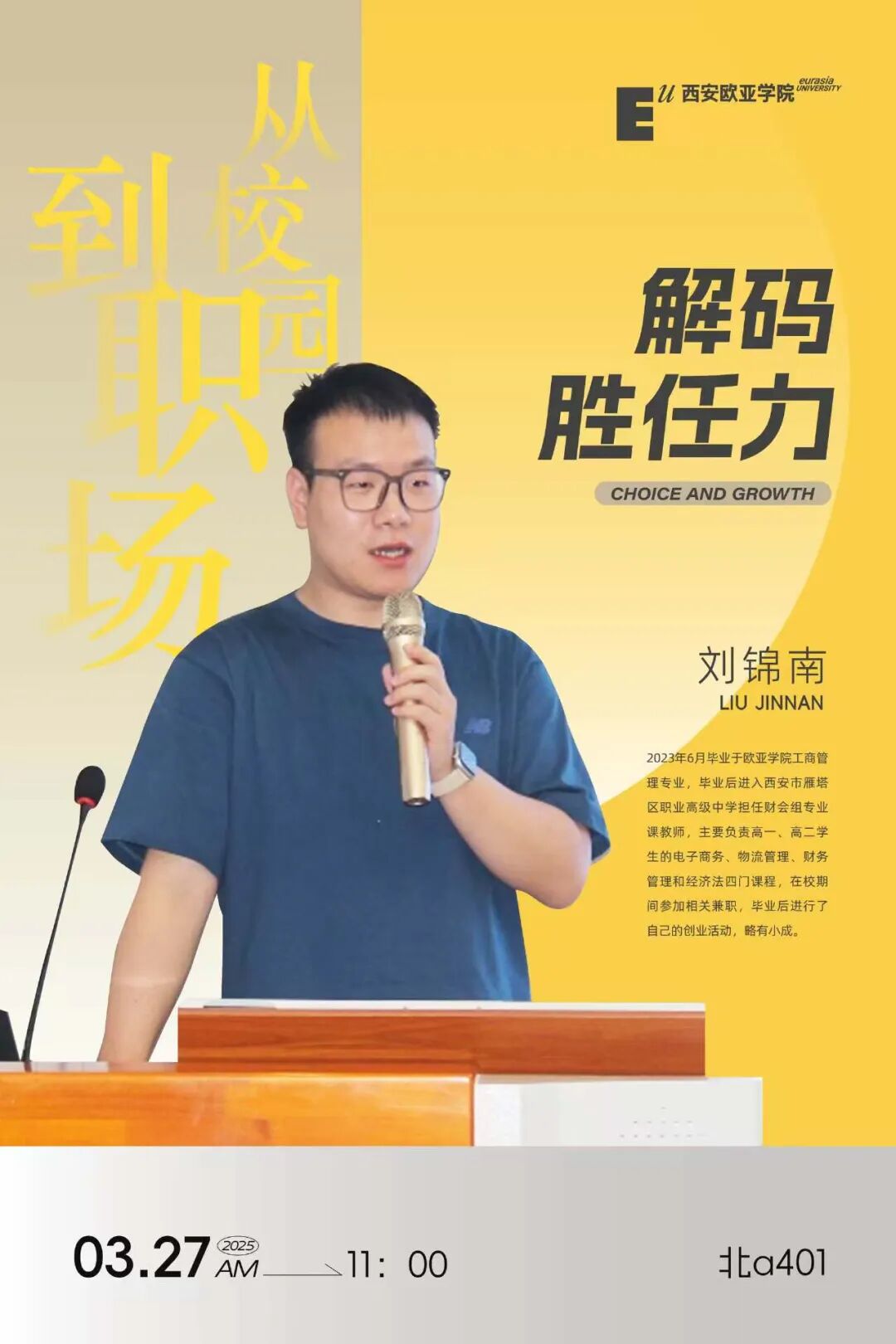 当《人力资源管理》课程特邀校友刘锦南走进课堂时,这位2023届工商管理专业毕业生,现任雁塔区职业高级中学财会系教师,用亲身经历为学弟学妹们解码了职场胜任力的进化密码,他这样分享道:“在欧亚的坐标系里,我找到了丈量人生的那把尺。”