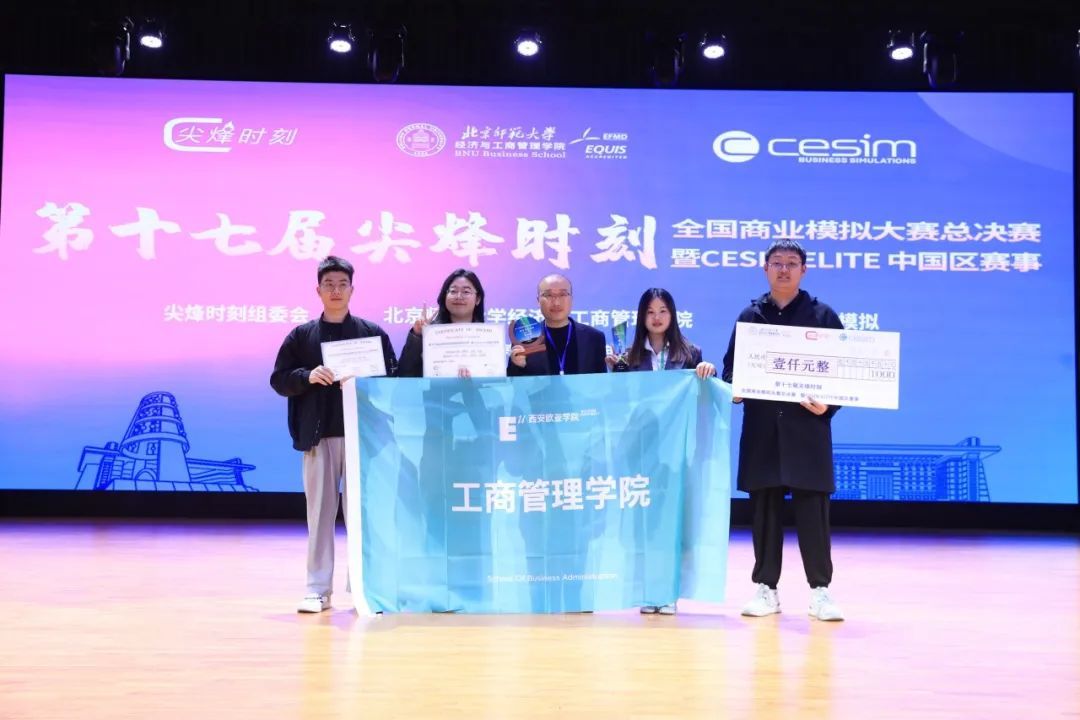 3月28日至30日,第十七届尖烽时刻全国商业模拟大赛总决赛暨Cesim Elite中国区赛事在北京师范大学隆重举行并圆满落幕。西安欧亚学院工商管理学院代表队“智联队”(团队成员:任荣、毕恒宇、张琳雪、胡振鹏;指导老师:王艳武)从全国170余所院校,超2000支团队中脱颖而出,凭借优秀的商业决策和“AI+CESIM BANK”案例的深度解析与创新实践,斩获全国一等奖,并获得大赛奖金1000元,指导老师王艳武荣获“优秀指导教师”奖。